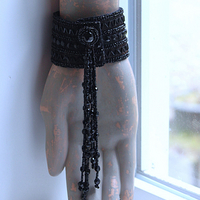Antique European Jet Bead Trim Bracelet Cuff with Antique Jet Bead Tassel & Snaps