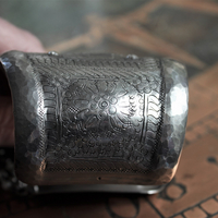 I purchased this unique cuff from one of my contacts in France many years ago; it is a mysterious and artistic piece with multiple engravings, textures and dimensions. It has an eight pointed star in the center with engraved borders and designs throughout....the tops and sides are a hammered finish and it is in excellent condition. Any spots or other marks are just reflections form the many dimensional surfaces of the cuff. There are what appear to be sterling punches in 3 places.