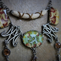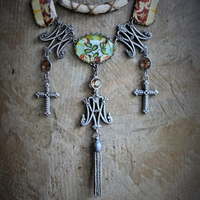 Ave Maria Necklace w/French Caron Freres Scrolled Initials AM Medals,Beveled Glass Connectors,French Crosses,Unique Fabric Finding