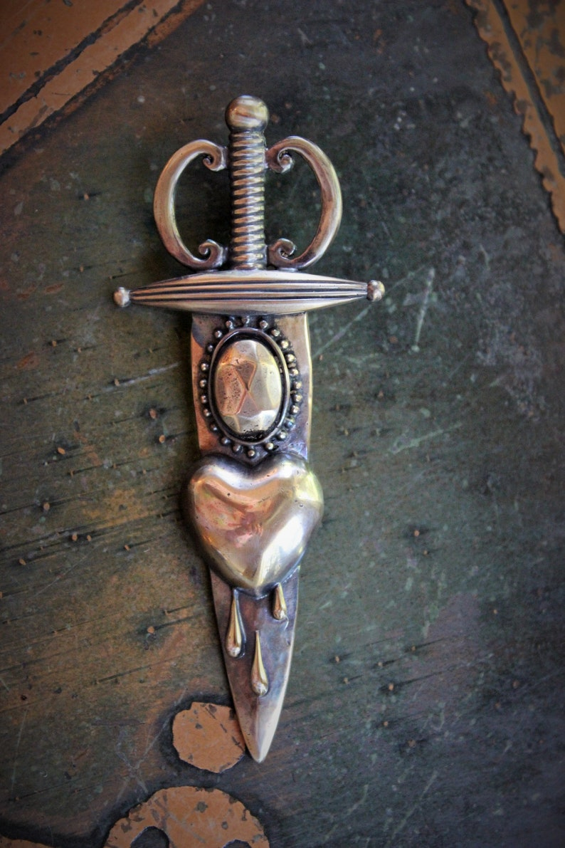 Beautiful Cast Bronze Pierced Heart & Sword Medal - note the exquisite details in the sword and raised puffy heart - shown in photo #2 as an example of what can be made out of this solid piece....has a bale on back to put on any chain (or leather ties!). Measures 3 1/4 inches long by 1 3/8 inches (at widest hilt point)