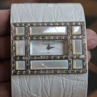 This is a classy, sophisticated vintage and long retired watch cuff from reknowned designer Valentino - the photos show the clean interior and unique watch face design. It is wide at 2 1/8 inches - and sized for up to 8 inch wrists - if you like it dangling it would fit a 6 1/2 inch wrist. It closes with a dual snap and lock clasp. A new battery will be placed when purchased!